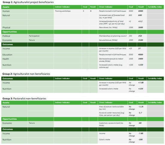 The third indicator type in the evaluative framework is (iii) an assessment of the Suitability of the chosen indicator in terms of the evidence provided that it will contribute to improved functionings. In the absence of sufficient information to assess outcomes, we felt the need to include some way of assessing the suitability of the assets and opportunities targeted. Though it may not be possible to express this as a quantified value, it should be possible to assess the evidence base and reasoning behind the inclusion of particular assets and opportunities. This should be based on previous research and pre-intervention assessments of the context. For example, a change in natural assets involving the introduction of a new tree species is more likely to contribute to functioning if there is access to a market for products that can be harvested from that species. Participatory decision-making environments are more likely to deliver better results if people have the human assets to contribute meaningfully. An increase in yields is likely to lead to higher income if market opportunities remain the same, and carbon sequestration may contribute more to increased income if there is access to carbon markets, and so on.