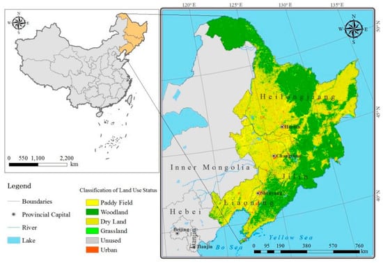 The northeast region is located in the northeastern part of China, including three provinces of Liaoning, Heilongjiang, and Jilin, with a total area of 787,300 km² (Figure 1). Among them, Heilongjiang Province includes 13 cities with a total area of 473,000 km2, Jilin Province includes 9 cities with a total area of 187,400 km2, and Liaoning Province includes 14 cities with a total area of 145,700 km2 [33]. On the whole, the northeast region has a temperate monsoon climate, and the terrain is mainly dominated by mountains and plains. It is the main grain production base in China and has made important contributions to ensuring national food security, and it also known as the “stabilizer” and “ballast stone” of China’s grain production [34]. However, due to the imbalance of the planting and breeding structure, the ecological environmental problems are becoming more and more prominent. On the one hand, this leads to the lack of nourishment of organic fertilizers and the decline in soil organic matter; on the other hand, it also leads to the destruction of the ecological environment [19]. Therefore, determining the scale of planting and breeding that matches the carrying capacity of arable land is the key to realizing the mutual connection, coordinated promotion, and common development of planting and breeding, so that agricultural resources can be fully and effectively utilized.