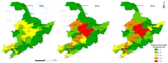 The livestock manure nitrogen nutrient supply in the northeast region in 2008, 2014, 2019.