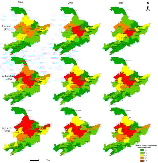 Figure 3 shows the manure nitrogen nutrient requirement of crops under three scenarios where the proportions of nitrogen nutrient in fertilization are 35%, 45%, and 55%, respectively. On the whole, the change range of the manure nitrogen nutrient requirement of crops in the northeast region was not very obvious. Except for Harbin and Suihua, which showed a relatively obvious growth trends, the change range of the rest of the regions was quite small, or increased or decreased slightly, indicating that the scale of the planting industry has remained basically unchanged.