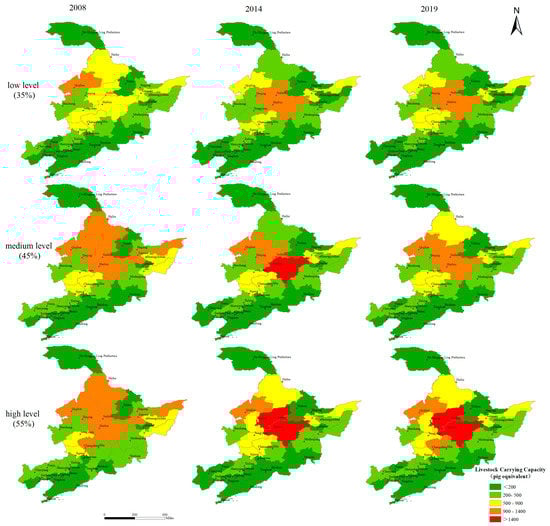 Figure 4 shows the livestock carrying capacity of farmland under three scenarios where the proportion of nitrogen nutrient in fertilization is 35%, 45%, and 55%, respectively. On the whole, the livestock carrying capacity in each region shows a downward trend, indicating that the capacity of farmland to absorb livestock manure was declining. However, it can be clearly seen from Figure 4 that the livestock carrying capacity of farmland in the 55% (high level) scenario is higher than in the 45% (medium level) scenario, and the 45% scenario is also significantly higher than the 35% (low level) scenario, indicating that the higher the proportion of nitrogen nutrient in fertilization, the higher the livestock carrying capacity of farmland. Additionally, combined with the pig equivalent level of livestock breeding in each region, it can be seen that the livestock production in 27 regions exceeded the actual carrying capacity in 2008, and in 29 regions it was exceeded in 2019.