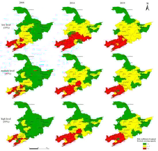 The risk coefficient of regional livestock carrying capacity of farmland in the northeast region in 2008, 2014, and 2019.