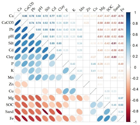 The Spearman’s Rho correlation coefficients among the soil properties were computed and sorted according to the first principal components in the correlation matrix for better visualization purpose (Figure 2). Significant relations between the basic soil properties, and basic soil properties and M3-extractable elements were noted.