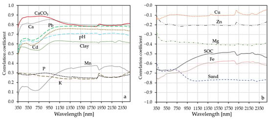 The Pearson correlation coefficients between soil constituents and reflectance values of the smoothed spectra for each wavelength were computed and plotted to visualize the relations between them (Figure 3). Generally, the correlation coefficients varied nearly from −0.80 to 0.90, likely depending on the soil properties across the wavelength range. However, the interpretation of correlations is complicated due to the complexity of overlapping spectral features of soil parameters. According to the correlation pattern, the soil properties could be categorized into two groups: the first group (CaCO3, clay, pH, Ca, Cd, K, Mn, P, and Pb) had positive (Figure 3a), and the second group (sand, SOC, Fe, Cu, Mg, and Zn) had negative correlation coefficients (Figure 3b). The soil properties in each group could be further divided into subgroups, e.g., based on the similarity of the correlation patterns: clay, pH, Mn, Pb, and Cd; CaCO3 and Ca; K and P; SOC and Fe; and sand, Mg, and Zn.