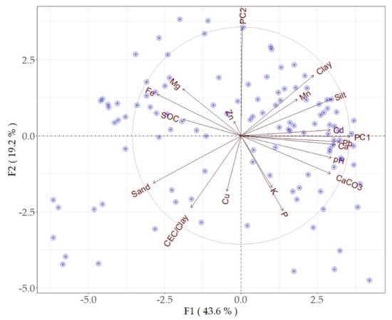 The PC1 was positively correlated with a group of soil properties (CaCO3, silt, clay, pH, Ca, Cd, Pb, and Mn) and negatively correlated with Fe, Mg, and SOC. The PC2 specifically showed orthogonality with the majority of parameters, whereas positive correlation occurred with Zn (containing less information) and negative correlation with sand, CEC/Clay, Cu, P, and K. Most of the soil properties except Zn, Cu, K, and Mn were approximately proportional to the variability included in the two components. The relations among particle sizes and CEC/Clay showed the expected typical pattern due to apparent collinearity. The sample distribution pattern far from the biplot origin confirmed considerable variability and better performance (Figure 4).