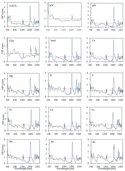 Variable importance in projection (VIP) scores associated with the PLSR models for the soil properties. The wavelength is considered as important if the VIP scores exceed the threshold value of 1 (dashed red line).
