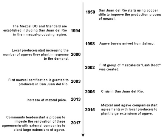 Figure 3 shows, in chronological order, a series of key events associated with agave and mezcal production in San Juan for the period 1950 to 2017. This draws on both interview and document review data.