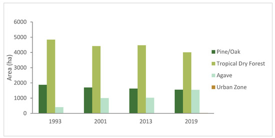 In this following section, we present the results of our LULC analysis for the period 1993–2019 (Table 4) (see Supplementary Materials Tables S4–S6), which covers the period when the mezcal sector in San Juan grew and took off as it became integrated into national and international markets.