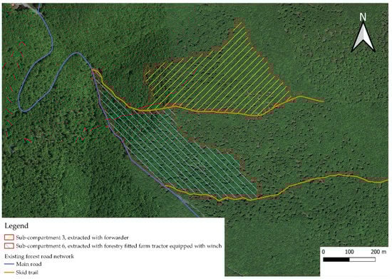 The two subcompartments were both harvested in 2020 by forest operators with similar working experience (>15 years). Felling and processing were carried out in both subcompartments in a motor-manual way by chainsaw. Extraction operations were performed with different systems. The CTL extraction system was performed by a forwarder (FORW) in the subcompartment n. 3, while in the subcompartment n. 6, the tree length system (TLS) was applied by a forestry-fitted farm tractor equipped with forest winch (WINCH). These systems represent the most applied harvesting machineries for logging activities in Mediterranean beech forests [36,39]. Indeed, while until some years ago winching was practically the only option for forestry interventions in beech high forests, in the last years there has been a growing application of forwarders [40]. Technical characteristics of the applied machineries are reported in Table 1.