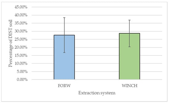 Both extraction systems led to a similar percentage of impacted surface (Figure 2). In detail, ground-based operations via winching and forwarding impacted about 28% of the overall surface, with values in line with similar systems applied in different conditions [25,54,55]. The low tree density of the investigated stands did not lead to a lower percentage of impacted surface. This was rather expected for the forwarder, considering the short working distance of this system, i.e., 10–12 m [36], forces the operator to extensively drive the machine along the stand. On the contrary, winching in the presence of a stand with low density (around 100 trees per hectare after the intervention) would assume a lower impacted surface, considering the possibility of winching on longer distances. It is probable that the obtained results, which do not confirm this assertion, are related to the limited application of snatch blocks which are effective solutions to reduce tree and soil damages during winching [56]. These results therefore suggest the importance of the application of best management practices during forest operations, considering that these are effective solutions to mitigate the negative impact of logging [57,58,59].