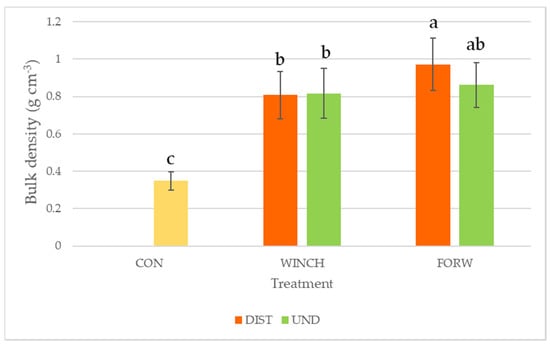 BD for the different treatments. Different letters indicate different homogeneous group according to an HSD Tukey test (p < 0.05): CON: control area; WINCH: winching; FORW: forwarding; DIST: soil directly affected by machineries’ passage; UND: soil in the harvested parcels but not directly affected by machineries’ passage.