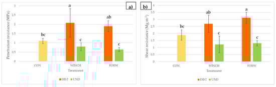 PR (a) and SR (b) for the different treatments. Different letters indicate different homogeneous group according to an HSD Tukey test (p < 0.05): CON: control area; WINCH: winching; FORW: forwarding; DIST: soil directly affected by machineries’ passage; UND: soil in the harvested parcels but not directly affected by machineries’ passage.