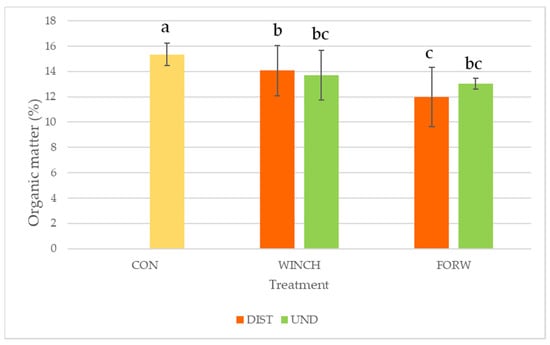 OM for the different treatments. Different letters indicate different homogeneous groups according to an HSD Tukey test (p < 0.05): CON: control area; WINCH: winching; FORW: forwarding; DIST: soil directly affected by machineries’ passage; UND: soil in the harvested parcels but not directly affected by machineries’ passage.