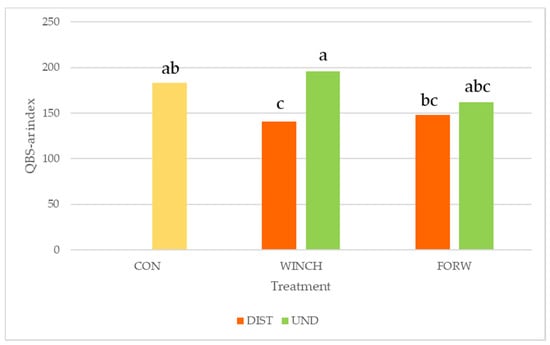 QBS-ar index values for the different treatments. Different letters indicate different homogeneous group according to the Duncan test (p < 0.05): CON: control area; WINCH: winching; FORW: forwarding; DIST: soil directly affected by machineries’ passage; UND: soil in the harvested parcels but not directly affected by machineries’ passage.