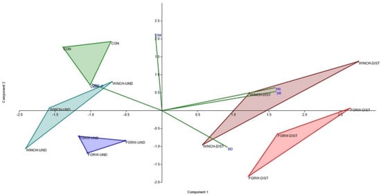 Focusing on an overview of the data found, Figure 7 shows the results of the principal Ccmponents analysis (PCA) to summarize the findings obtained in a comprehensive graphical framework. The two principal components PC1 and PC2 explained 48% and 26% of the total variance, respectively. It is evident how the undisturbed areas are close to the control one, while disturbed zones are more distant, thus highlighting a higher impact on the soil features. Moreover, the distance from the CON as compared to the WINCH-DIST, showed that FORW-DIST had a greater impact.