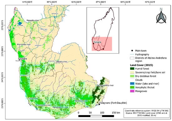 - Randriamalala, J.R.; Hosnah, B.H.; Ranaivoarimanana, S.; Ratovomalala, R.I. Dynamiques spatiales des fourrés xérophiles de Betioky-Sud et Soalara-Sud (Madagascar). In Transitions Agraires au sud de Madagascar. Résilience et Viabilité, Deux Facettes de la Conservation. Actes du Séminaire de Synthèse du Projet FPPSM; Hervé, D., Razanaka, S., Rakotondraompiana, S., Rafamanta-nantsoa, F., Carrière, S., Eds.; 10–11/06/2013; IRD-SCAC/PARRUR: Antananarivo, Madagascar, 2015; pp. 113–121. [Google Scholar]