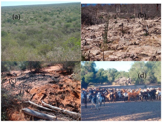 Xerophytic thicket (XT) landscape: (a) global view; (b) XTs after slash-and-burn agriculture; (c) a former wood charcoal kiln; (d) a goat herd.
