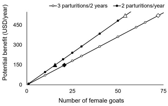 Potential benefit from the simultaneous application of the flushing and batch breeding techniques []. The black triangle and black diamond denote the minimum numbers of female goats required to replace the income from wood charcoal production (15 and 21 goats, respectively); the white triangle and white diamond denote the minimum numbers of female goats required to replace the income from wood charcoal production and slash-and-burn agriculture (54 and 72 goats, respectively).