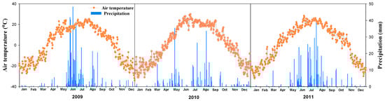 Daily meteorological data from 1 January 2009 to 31 December 2011 were obtained from the meteorological station in the Hailun national ecology experimental station, which is 100 m away from the experimental plots. Of all the data, daily global solar radiation (J s−1 m−2), average air temperature (°C), precipitation (mm), and relative humidity (%) were recorded at 1.5 m, and wind speed (m s−1) was recorded at 8 m above the ground. All the above data were applied as driving variables in the CoupModel. The temporal variation of precipitation and average air temperature from 2009 to 2011 are shown in Figure 1.