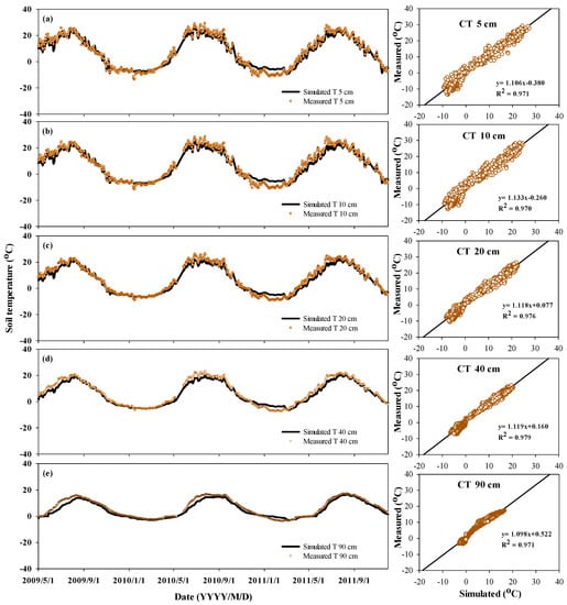 Simulations vs. measurements of daily soil temperatures at (a) 5 cm, (b) 10 cm, (c) 20 cm, (d) 40 cm, and (e) 90 cm for CT during 2009–2011.