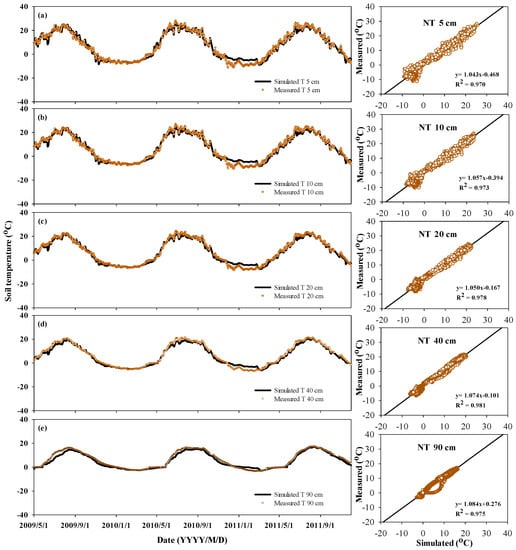 Simulations vs. measurements of daily soil temperatures at (a) 5 cm, (b) 10 cm, (c) 20 cm, (d) 40 cm, and (e) 90 cm for NT during 2009–2011.