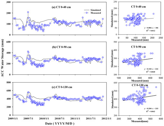 Simulations vs. measurements of water storage at (a) 0–40 cm, (b) 0–90 cm, and (c) 0–130 cm for CT during 2009–2011.