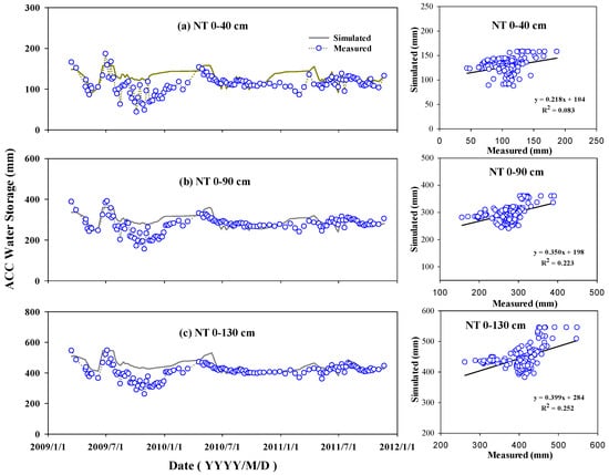 Simulations vs. measurements of water storage at (a) 0–40 cm, (b) 0–90 cm, and (c) 0–130 cm for NT during 2009–2011.