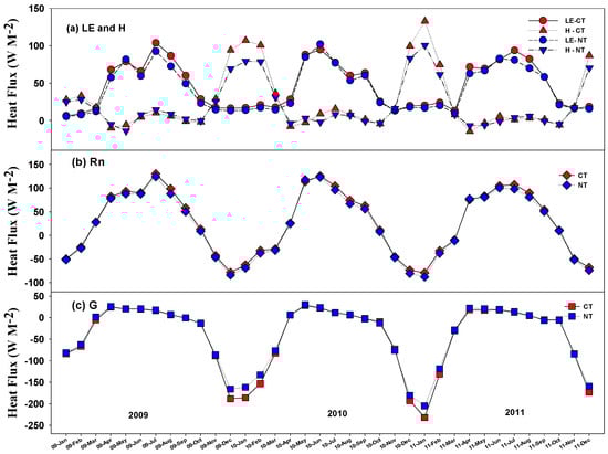 The heat balances for CT and NT treatments shown in Figure 6 were generated from a single simulation using the parameters calibrated for the CT and NT treatments, respectively (Table S2). Similar varied trends of simulated net radiation (Rn) for CT and NT were found during 2009–2011, both increasing from January then decreasing gradually. The maximum values appeared in June or July, and the minimum values appeared in December (Figure 6a). In general, the simulated Rn for CT was equal to or slightly higher than those for NT.