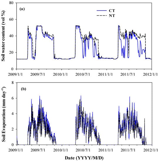 Simulated (a) daily average soil water contents at 0–10 cm depth and (b) daily soil evaporation for CT and NT during 2009–2011.