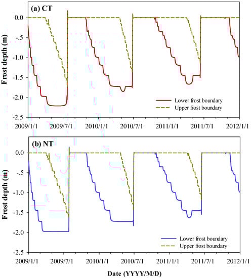 As the soil frozen depths dynamics were influenced by both soil temperature and soil water, after the model calibration and evaluation used measured soil temperature and soil water storage data, the soil frozen depth dynamical curves under CT and NT treatment were reproduced by the calibrated CoupModel. The simulated frost depth showed realistic frost depth values during the freezing and thawing periods as the soil started to freeze at the end of October and then gradually went down to the deepest depths for both CT and NT treatments (Figure 8). The mean annual freezing period is usually from the end of October to mid-April of the following year, while the mean annual thawing period is normally from the beginning of April to the end of June for both treatments. Hence, more than 50% of the whole year is in freeze–thaw environments, and the soil physical characteristics change seasonally, which could increase the uncertainty of estimating suitable parameters by the model. The lower frost boundary showed more variability than the upper frost boundary. The lowest frozen depths were 2.21 m, 1.85 m, and 1.67 m below the soil surface for CT in 2009, 2010, and 2011, respectively (Figure 8a). However, NT showed lower values compared with CT, with the lowest frozen depths being 1.98 m, 1.73 m, and 1.63 m below the soil surface in 2009, 2010, and 2011, respectively (Figure 8b). The frozen depths were similar to the values (1.77 m to 2.77 m) reported by Wu et al. [3] in the same research region in China. The simulated average thawing rate was approximately 2.1 cm day−1, which was similar to the estimated values reported by Zhang et al. [52] in the same region of China (2.1–2.4 cm day−1).