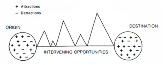 Urban systems exist at the micro, meso, and macro scales. The micro scale consists of people, institutions, and firms as key elements of a city. The meso scale represents a city as a geographic entity, and the macro scale involves a system or network of cities interacting at national and global levels [27]. The study of how an urban system at the macro scale is influenced by flows of people and goods gained prominence in the 19th century when Ravenstein [28] hypothesized that population movement is influenced by the size, distance, and direction between settlements, and their economic development levels, as well the socioeconomic characteristics of their inhabitants. Later, in the late 1960s, the sociologist Everett Lee [29] suggested a model that describes a set of push and pull factors that govern the volume of population flows between two cities: origin and destination (Figure 1). The model postulates that population mobility is influenced by some attractions (pull factors) and detractions (push factors) present in origins and destinations and intervening opportunities. Socioeconomic factors such as employment, education, tourism, and entertainment, and natural endowments like water, minerals, and climate push or pull people from one city to another. The distance between cities is one of the most important intervening factors, because it is always present regardless of the number and gravity of attractions and detractions. Thus, the volume of flows depends on the interplay of all of these factors.