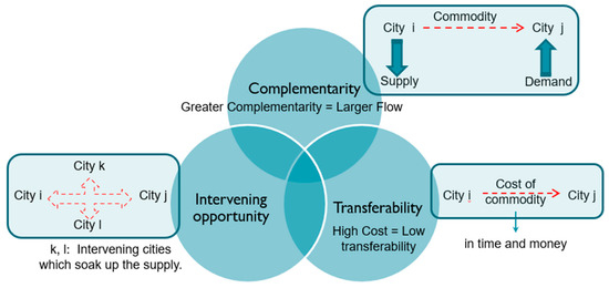 Regarding the flow of goods, the contribution of Ullman’s [34] essay on American Commodity Flow is vital to understanding the impact of flows on urban system dynamics. The essay identified complementarity, intervening opportunity, and transferability as three key elements that shape the geography of commodity flows (Figure 2). At the end of the paths that goods and services follow and cross is the ultimate goal of achieving strong supply chain management that integrates process-oriented planning and controls the flows from the end consumer to the raw material supplier.