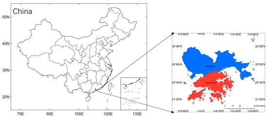 Study areas of Hong Kong (red) and Shenzhen (blue).