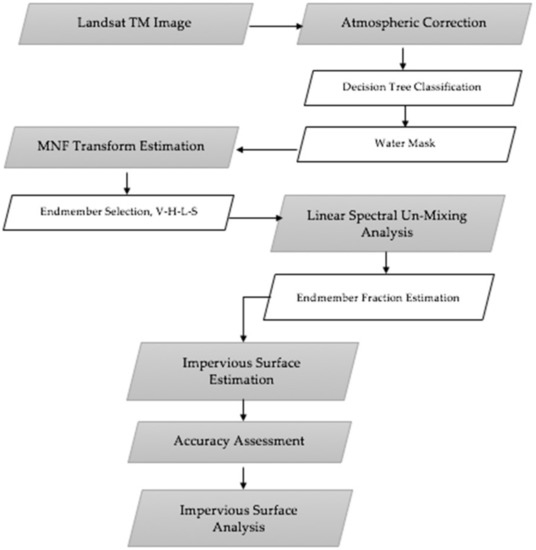 Figure 2 shows the procedures of processing the Landsat TM images and extracting impervious surfaces with ENVI software. An atmospheric correction of Landsat images was performed to enhance visibility and increase accuracy for the selection of endmembers. A water mask, which was created for the sea area, water area, and the regions outside of the study areas, was required to cover Landsat images. Subsequently, MNF transform, producing six layers, demonstrated the contribution rate of the dimensionality of each layer [21]. The results of MNF component 1, MNF component 2, and MNF component 3 were applied to the 2D scatter plot to identify the four endmembers, similar as the previous studies [13,14]. As a result, the linear spectral un-mixing analysis was conducted to generate the five fraction’s images, corresponding to vegetation, high-albedo, low-albedo, and soil, and root mean square error (RMSE), in which impervious surface was determined by superimposing the images of high-albedo and low-albedo fractions. Albedo is a measure of reflectivity that depends on the amount of light being reflected or absorbed by a surface or material. Shallow objects or surfaces reflect more radiation, resulting in high-albedo, and darker objects absorb more radiation and reflect less light, resulting in low-albedo. The values of high-albedo ranged between 0.4 and 0.7, and the values of low-albedo ranged between 0.04 and 0.4 [22].
