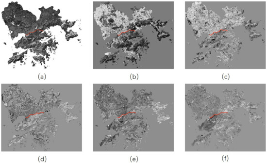 MNF components: (a) MNF Component 1; (b) MNF Component 2; (c) MNF Component 3; (d) MNF Component 4; (e) MNF Component 5; (f) MNF Component 6.