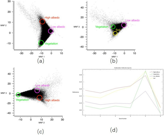 Figure 4a–c shows the selected endmember’s scatter plots, in which MNF1-MNF2 is corresponding to high-albedo, low-albedo, and vegetation, while MNF1-MNF3 to vegetation, low-albedo, and soil, and MNF 2-MNF3 to high-albedo, low-albedo, and vegetation [14]. The noise fraction, i.e., heterogeneous spatial-spectral signs, is represented by black dots diffusing at angles of the triangle.
