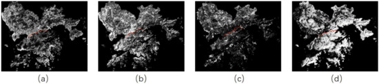 Figure 4d shows the reflectance of the four endmembers. From band 1 to 4, high-albedo showed the highest reflectance, soil exhibited the second-highest reflectance, low-albedo showed the third-largest reflectance, and vegetation exhibited the lowest reflectance. In band 5, vegetation exhibited the largest reflectance, soil showed the second-largest reflectance, high-albedo exhibited the third-largest reflectance, and the lowest reflectance was shown by low-albedo. Figure 5 shows an example of the water mask in 2016.