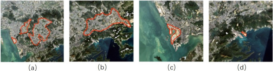 The increase in impervious surface areas of Shenzhen: (a) the central, eastern, and western part of the Baoan District; (b) the expansion of the Longgang District; (c) the expansion of the southeastern part of the Nanshan District; (d) the southeastern part of the Yantian District.