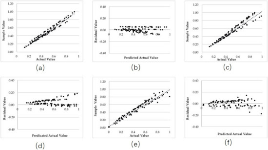 Figure 12a,c,e shows the results of the regression model for the actual value and predicted value in 1995, 2005, and 2016 [8]. Table 4 shows that the value of R2 of the Landsat TM images was 0.97 in 1995, 0.95 in 2005, and 0.96 in 2016, which was acceptable. The values of RMSE (Equation (4)) and MAE (Equation (5)) were 3.67% and 2.98% in 1995, 6.36% and 4.49% in 2005, and 4.92% and 4.12% in 2016. The residual analysis is demonstrated in Figure 12b,d,f, and the value range was between 0.2 to −0.2.