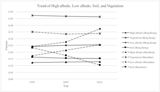 Trend of high-albedo, low-albedo, soil, and vegetation for Hong Kong and Shenzhen.