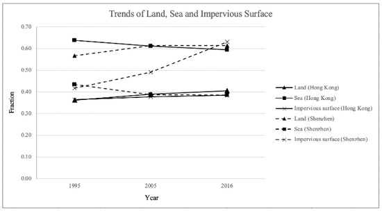 Figure 15 presents the trends in Shenzhen and Hong Kong for change in the land, sea, and impervious surface. The calculated total areas of Hong Kong and Shenzhen were 2755 km2 and 3140 km2, respectively, which comprised areas of land and sea. Table 5 shows the percentages and areas of land, sea, and the impervious surface of Hong Kong and Shenzhen. Regarding Hong Kong, from 1995 to 2016, land area rose 12.04%, sea area decreased 4.74%, and impervious surface increased 5.57%. Shenzhen had an 8.37% growth in land area, a 10.92% decline in sea area, and a 50.91% growth in impervious surface area from 1995 to 2016. Hong Kong and Shenzhen have distinctly different land policies and thus, Hong Kong had a slight increase in urban areas and Shenzhen had a dramatic increase in urban areas from 1995 to 2016 (Table 5).