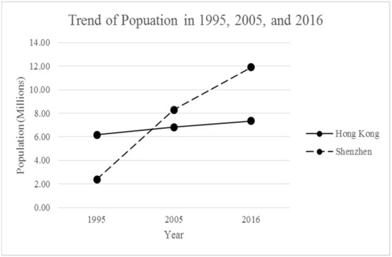 Figure 16 illustrates the population trend of Hong Kong and Shenzhen in 1995, 2005, and 2016. The population of Hong Kong constitutes an increase rate of 10.55% from 1995 to 2005 and 7.78% from 2005 to 2016. The overall rate of Hong Kong’s population growth from 1995 to 2016 was 19.16% [37,38,39]. The population of Shenzhen exhibited an increase rate of 246.44% from 1995 to 2005 and 43.84% from 2005 to 2016, and the overall population rate increase was 398.33% [40,41,42].