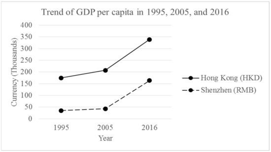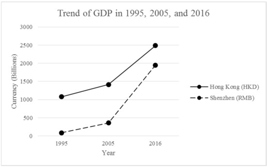 The GDP trend of Hong Kong and Shenzhen in 1995, 2005, and 2016 is presented in Figure 17. The GDP of Hong Kong exhibited an increase rate of 31.10% from 1995 to 2005 and 76.27% from 2005 to 2016, and the overall GDP rate increase was 131.10%. The GDP of Shenzhen exhibited an increase rate of 327.38% from 1995 to 2005 and 443.18% from 2005 to 2016, and the overall increase rate was 2221.43%.