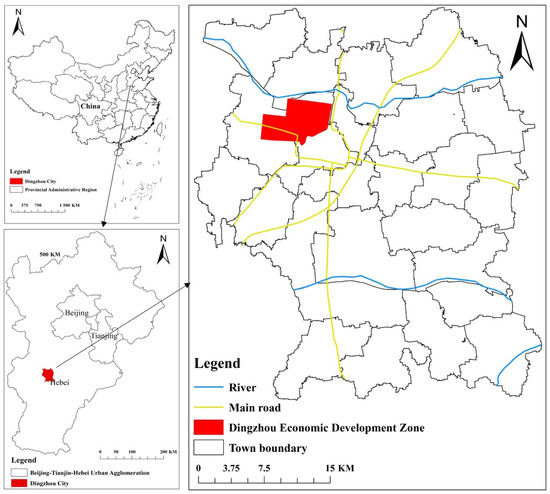 The Dingzhou economic development zone, located in the Beijing–Tianjin–Hebei urban agglomeration, belongs to the provincial development zone, with 30 km2. The development zone has a superior geographical location, and by road, local travelers can reach the Beijing, Tianjin, and Hebei International Airport within two hours (Figure 1). Founded in December 2008, the development zone is one of the first industrial clusters and one of the 14 industrial focus areas of more than USD 15 billion.