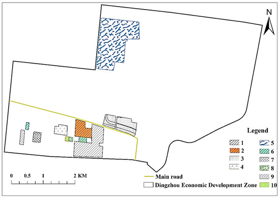 Figure 2. Typical enterprise distribution in the Dingzhou economic development zone (1: Hebei Changan Automobile Co., Ltd.; 2: Baoding Changan Bus Manufacturing Co., Ltd.; 3: Hebei Xuyang Coking Co., Ltd.; 4: Dingzhou Jiabitong Auto Parts Co., Ltd.; 5: Hebei Dongxu Chemical Co., Ltd.; 6: Lingyun Industrial Co., Ltd. Dingzhou Branch; 7: Hebei Shuangcheng Machinery Manufacturing Co., Ltd.; 8: Dingzhou Zhixin Machinery Manufactur-ing Co., Ltd.; 9: Dingzhou Hongyuan Machinery Co., Ltd.; 10: Hebei Hyde Auto Parts Co., Ltd.).