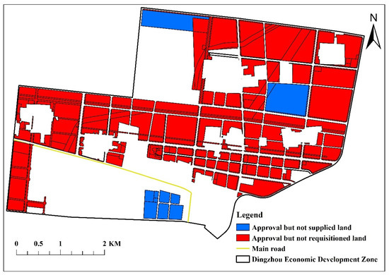 According to the report of the intensive economy evaluation of the Development Zone, there were many unfulfilled land requisitions in the Dingzhou economic development zone. The land granted but not collected was 1378.45 hm2, and the land not supplied was 165.48 hm2; the distribution is shown in Figure 4.