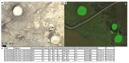 Documentation of mound structures. (a) Identified in aerial photographs from 1966 (SGM 1:20,000). (b) Field record of the central point and polygon. (c) Some of the variables recorded in the field and inputted into the GIS.