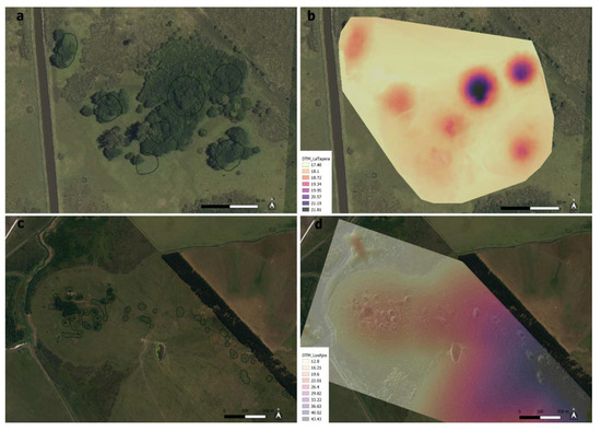 Geospatial record of earthworks in the field. (a,b) Orthoimage with GPS polygons of the different earthworks and DTM created via topography with total station of the La Tapera ensemble of mounds. (c,d) Orthoimage with GPS polygons of different earthworks and DTM created via drone photogrammetry of the Los Ajos mound site.