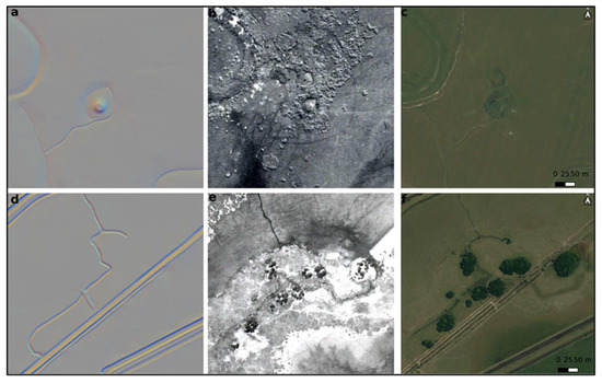 Documentation process of mounds and associated archaeological features using three different sources of information: hillshade calculated from multiple directions. (a,d), Historical aerial photographs (b,e), and present-day orthoimages (c,d). Location of a mound site composed of two mounds (a–c). In the DTM, a single mound appears (a); in the aerial photograph (b) and orthoimage (c) two mounds are identified. Group of mounds and associated anthropic canals (d–f): the mounds identified in the aerial photograph and orthoimage (e,f) are not represented in the hillshade (d). Furthermore, the presence of canals and depressed areas in the terrain around the mounds and groups should be noted (a,d).