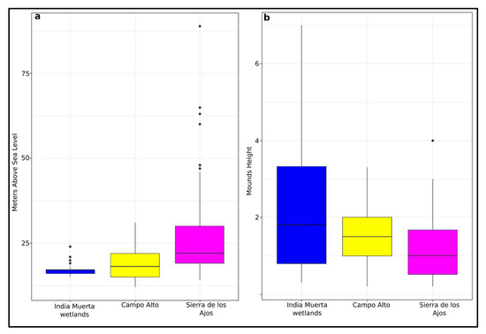 The mound sites are situated at different levels of the terrain, even inside each mound site with significant differences. The cerritos of the India Muerta wetlands present low variability in terms of emplacement and are located at an average level of 17 masl, which does not correspond with the lower altitudes of the lowlands. Campo Alto is an area with average levels of 19 masl with a greater variability than the previous area. The cluster corresponding to the Sierra de los Ajos presents the highest levels, with an average of 26 masl and a greater variability in emplacement. In these analyses, it is also worthy of note that, for the whole area, no mounds are recorded below 12 masl (Figure 7).